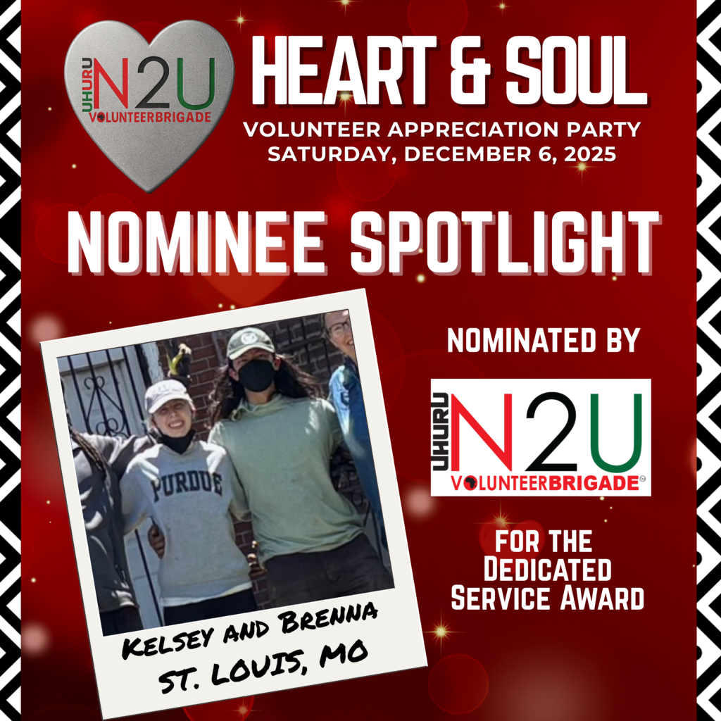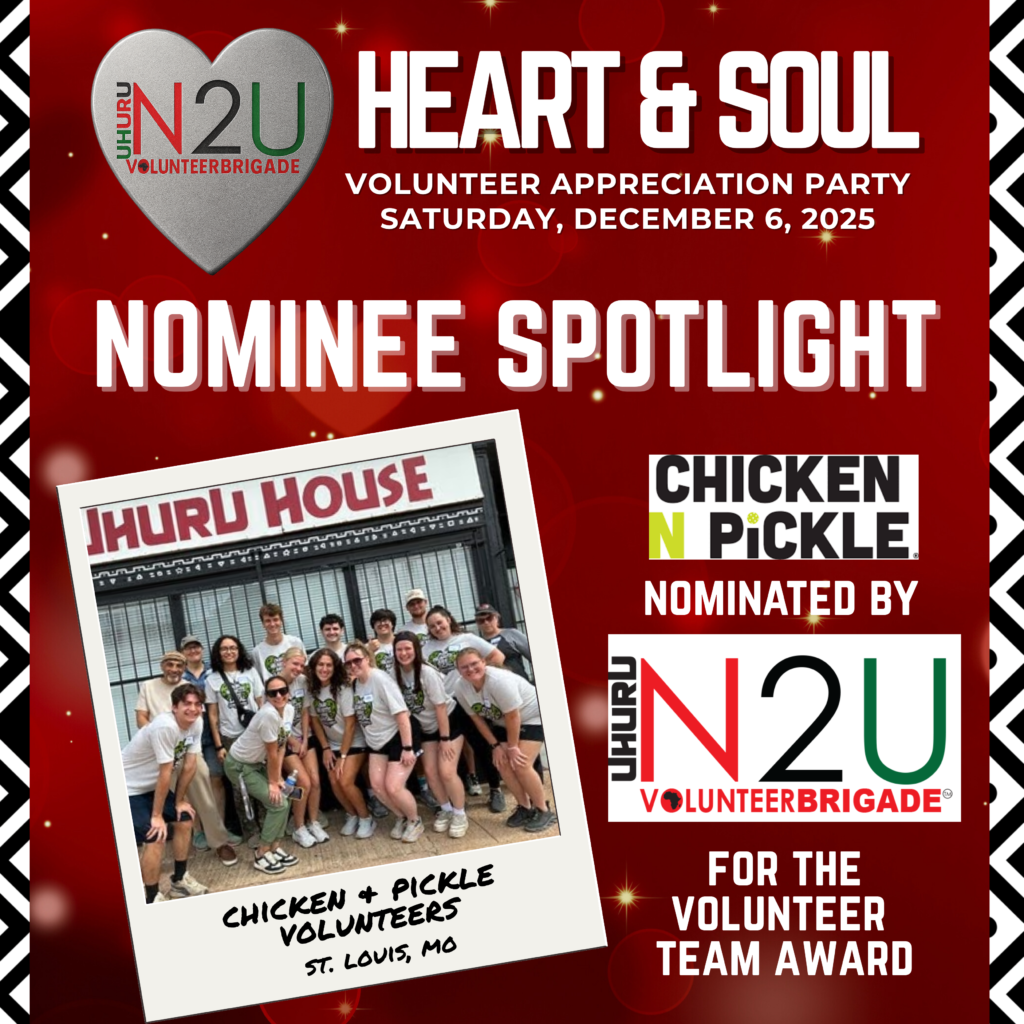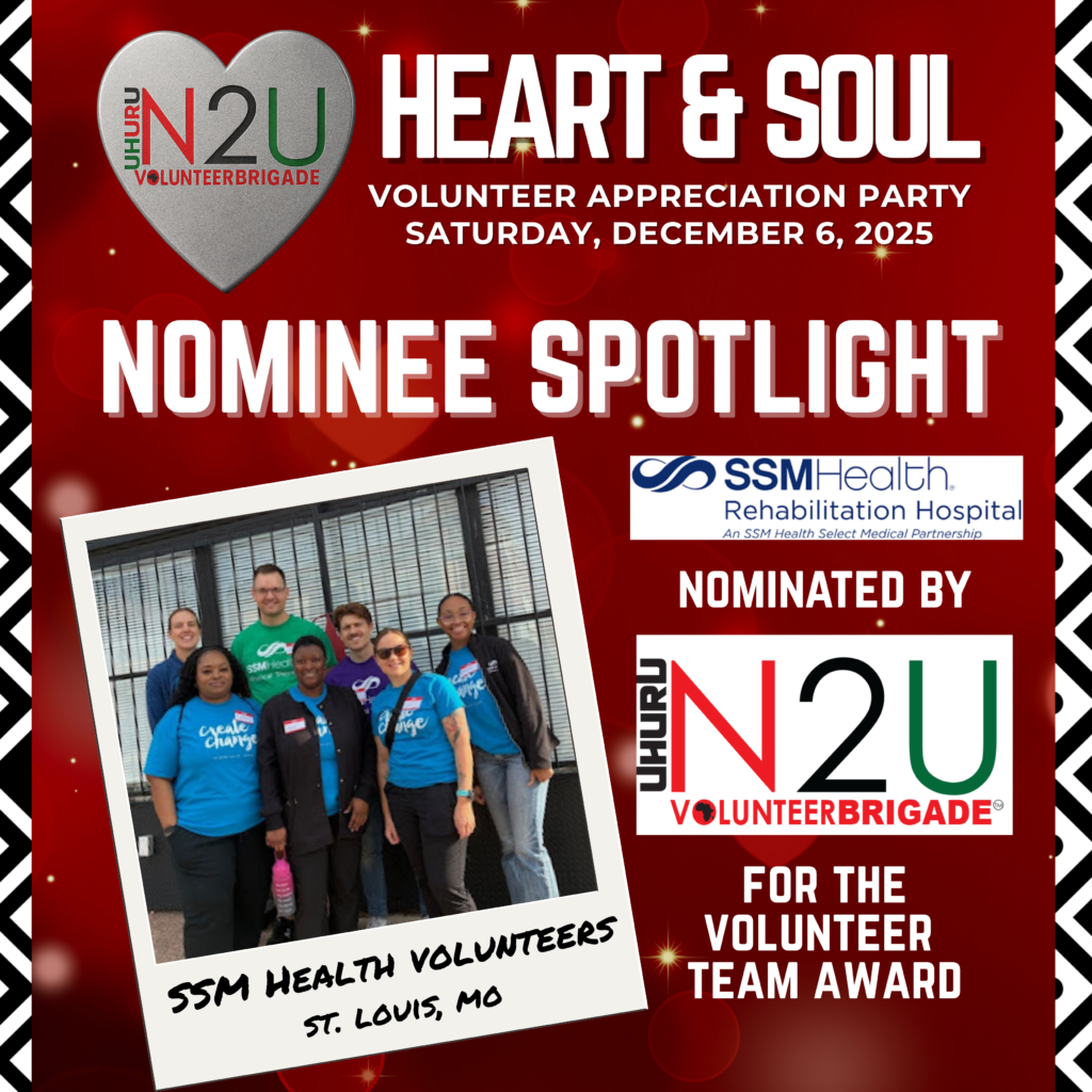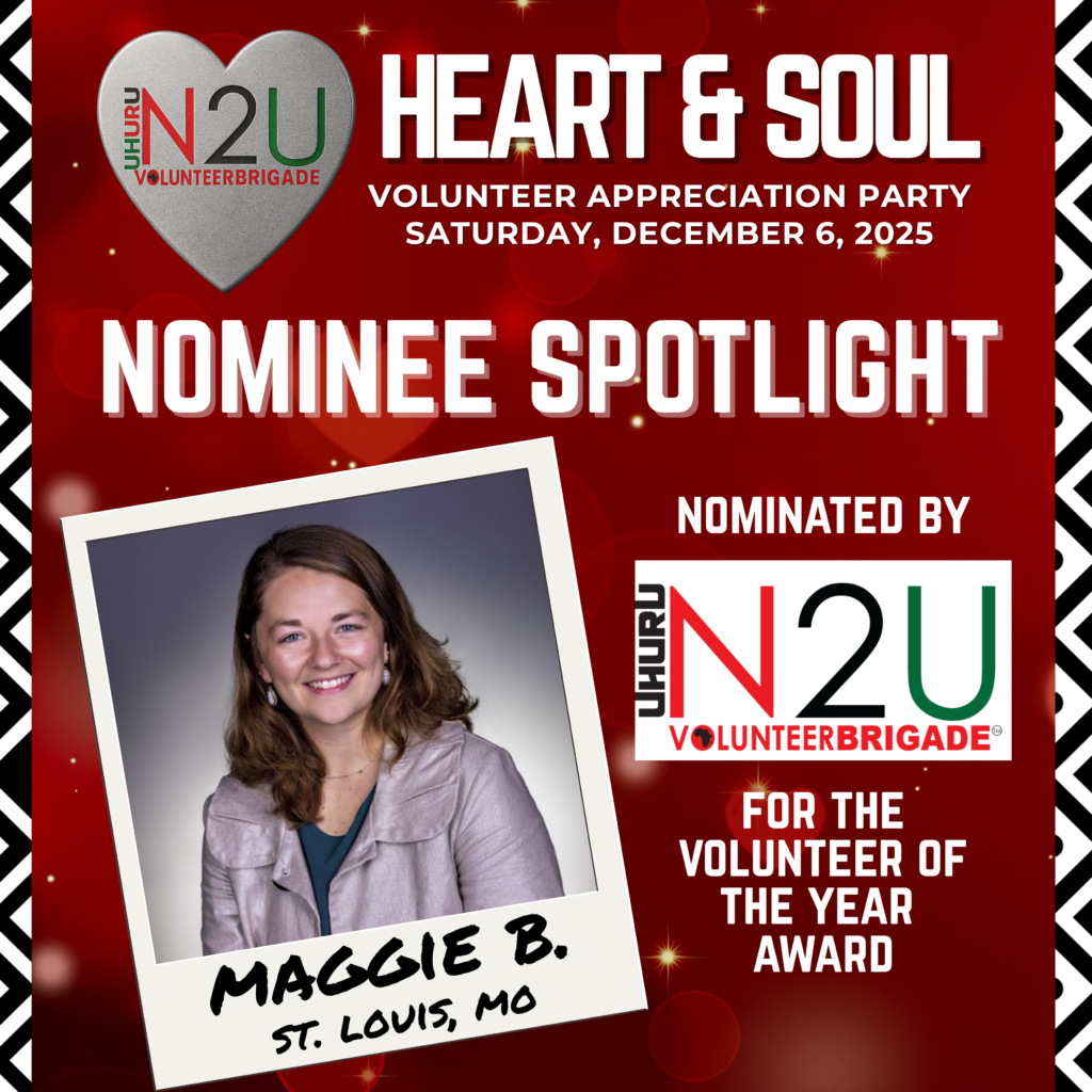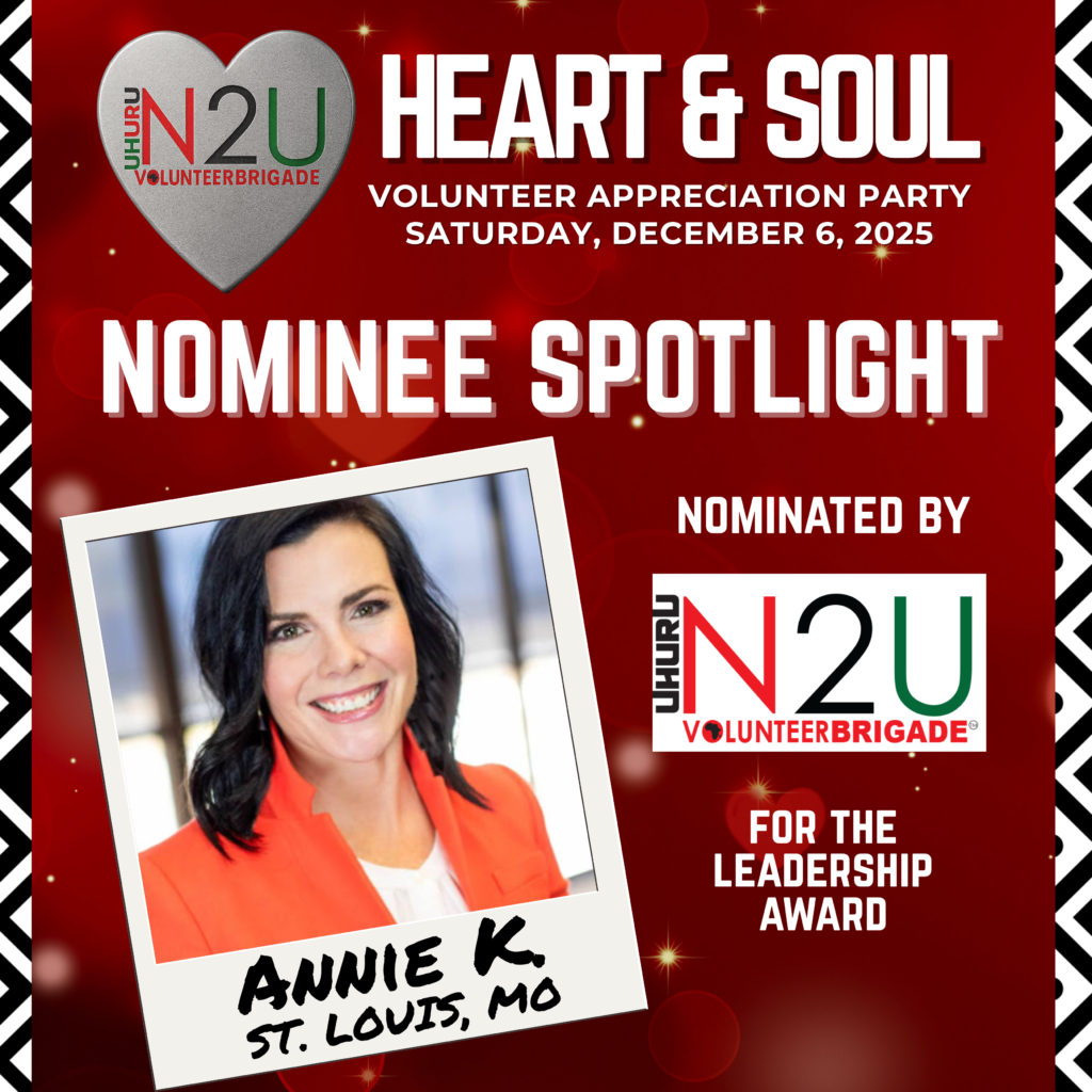 The 4th Annual Uhuru N2U “Heart and Soul” Volunteer Appreciation party is coming up soon, Saturday, December 6th, 2025 at 3 pm CT. This year has seen a record-breaking number of volunteer nominees for the annual volunteer award categories. Over 50 nominations have been received and all reflect amazing work done by our incredible volunteers! Below we name each category along with pictures of the nominees and who nominated them. Click here to register for this event. Attend in-person in St. Louis, MO or St. Petersburg, FL, or attend remotely via Zoom.