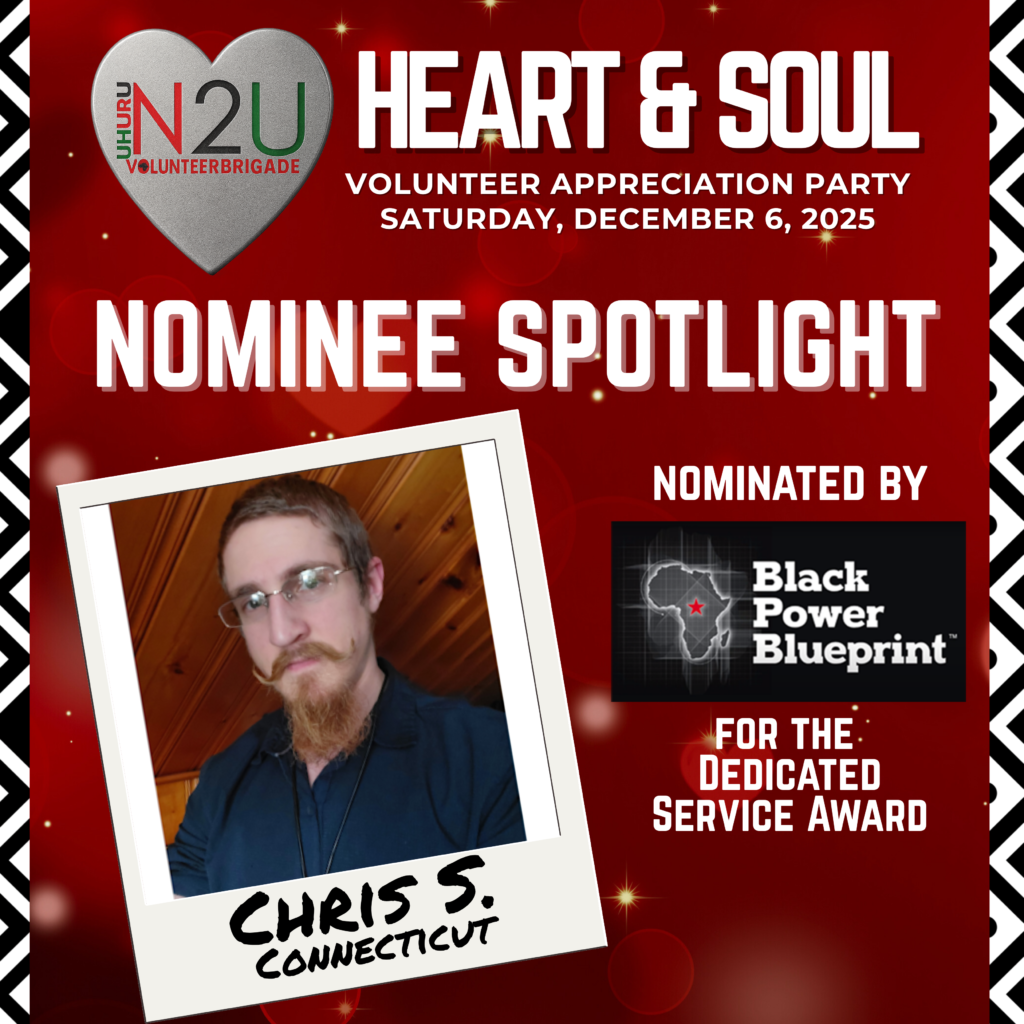 Chris, a dedicated member of the Black Power Blueprint Promotions Team since 2020, is a self-taught film maker. Based in Connecticut, Chris attends the BPB promotions team meetings and shares his skills, resources and enthusiasm and helps move the promotions work forward. Chris’ short videos, produced weekly, have generated thousands of views on Black Power Blueprint social media sites. Chris has produced videos including clips on the true history of St. Louis including the destruction of the African community of Mill Creek Valley and poisoning the African residents of the Pruitt Igoe housing project. Chris has produced multiple video clips from local news media and City Hall recordings showing the influence of Black Power Blueprint and NINA in the aftermath of the May 16th tornado that devastated the black community. His unity with African self-determination comes through in his excellent sense of timing, creativity and going the extra mile in these productions.