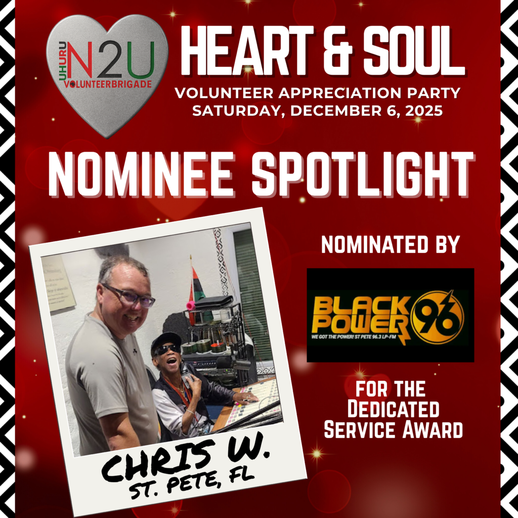 Chris W. is an exceptional volunteer whose time and technical expertise have strengthened Black Power 96 Radio. His determination to improve the station’s technical operations have made a lasting impact. When Black Power 96 organized a webinar to raise funds for a new Emergency Alert System after the purchase was defunded by Pinellas County and the cancellation of FEMA/CPR grants, Chris reached out to local radio stations and organized a simulcast of the fundraising program. When Black Power 96’s broadcast mixing board died, Chris and Radio Free Gulfport donated a better one. He installed it and created braille labels for the equipment, which helps our volunteers with accessibility needs. Chris has donated and installed various pieces of studio and broadcast equipment. His willingness to step in whenever needed and share his expertise exemplifies what it means to be a dedicated volunteer. Black Power 96 is truly fortunate to have his knowledge, compassion and commitment.