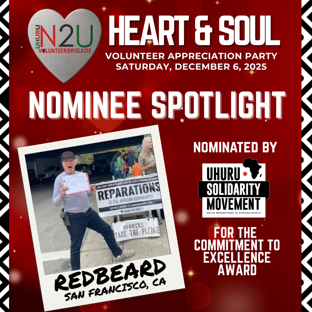 David R. aka Redbeard has been a strong advocate for the African People’s Socialist Party for over four decades. This year as the membership coordinator for USM SF Bay, he has brought his infectious enthusiasm to the work. He contests the gloom-and-doom panic experienced by many in the SF Bay Area with a deep revolutionary self-confidence in being on the winning side of anti-colonial resistance. This year he set out with the goal to meet with every local member to convey our appreciation and to discuss how they would like to be involved in the work. He is someone to emulate when it comes to meeting the people where they are at and taking them to a new level of support. We deeply appreciate the stand Redbeard takes in the interest of African working class self-determination, from struggling that we have enough literature, to being out on the streets in unity with the anti-colonial struggle.