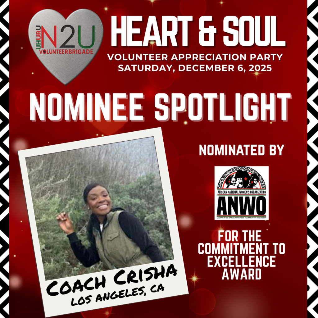 La Crisha W. has been volunteering with the African National Women’s Organization since the start of ANWO’s Los Angeles Branch in 2022. Leading our Fit to Fight program. An innovative program designed to be a holistic approach to empower our members for self-sustainability and self-preservation. In a world where resilience is the key to survival. Leading the Black August Fit To Fight program for the last two years. Training us with workouts Every Sunday and leading a guided meditation every Tuesday and Thursdays through the month of August as we focused on Political Prisoners and building discipline that we need for the fight. Coach Crisha’s leadership reflects the belief that wellness is a weapon — one that protects the body, renews the mind, and uplifts the spirit. Her dedication continues to inspire a movement of healthier, stronger, and more purpose-driven women ready to serve their families, and communities.