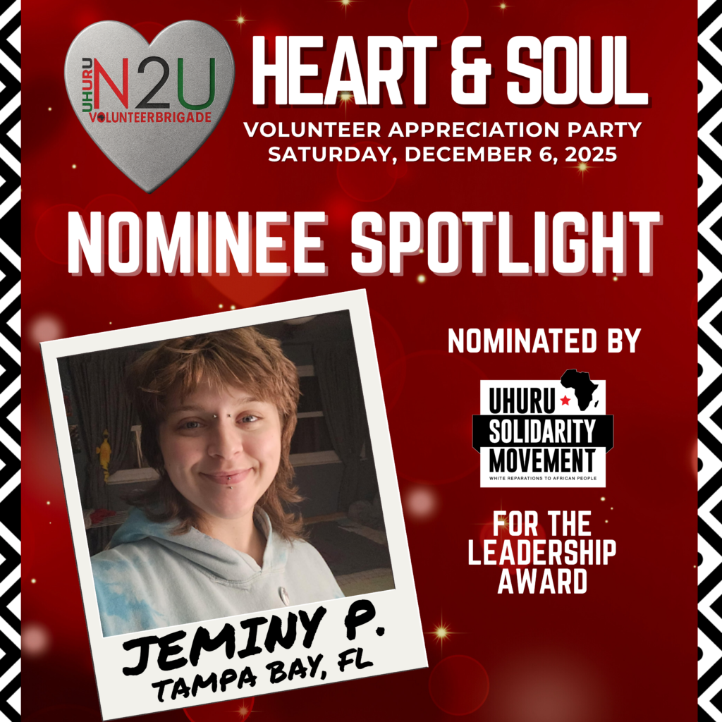 USM met Jeminy in Jacksonville at a National Alliance Against Racist & Political Repression Conference. They came to volunteer at our local Earth Day outreach, and began attending local USM meetings. They enthusiastically jumped into the role of Logistics Coordinator and Artists Liaison for our “Artists Against Genocide” Benefit. Jeminy organizes their friends and colleagues, and others in the community, to be a part of building USM events and filling needed roles. Jeminy is now Secretary of USM Tampa Bay branch, demonstrating leadership and holding things accountable. They are also part of the 2025 Reparations Telethon Committee. Thank you Jeminy!