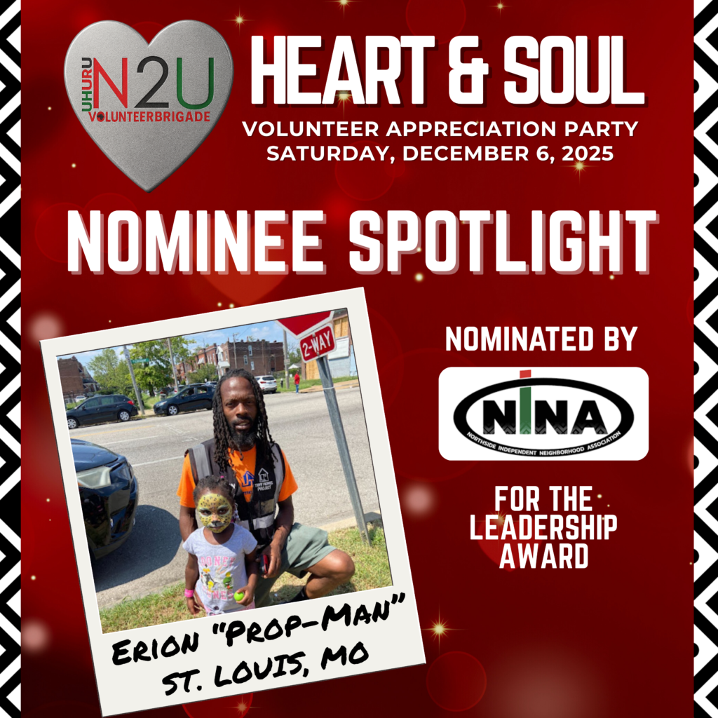 Erion “Prop-Man” is a life-long resident of St. Louis, father and advocate for the African community. He has dedicated many years working with young African women and men, teaching important trade skills, particularly in how to build tiny homes. He and his organization, Youth Builders, volunteered their time to set up and break down the Northside Community Block Party. They brought a bus to the Block Party outfitted as a house to show how they help the community find accessible housing. All Youth Build members gave moving testimonies about how deeply they appreciated Erion’s mentorship and training. They have learned new skills, confidence and pride working to benefit the African community. His commitment to the northside African community is strongly felt by his efforts to teach over 300 young people how to build tiny homes for free since the May 2025 tornado that devastated many areas of the northside. They donated several tiny houses to residents whose homes were destroyed by the tornado. He has received no recognition nor funding from the city government, still his unwavering commitment to teaching young Africans real world skills remains strong. There is no other organization that has taught more people trade skills for free.