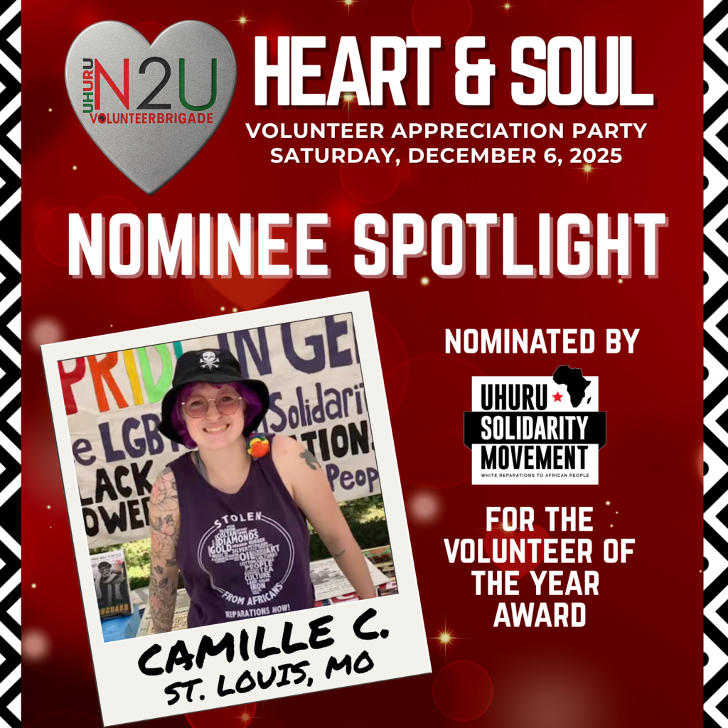 Camille saw the USM reparations banner at the Earth Fest booth in April and enthusiastically declared, “Sign me up!” Since then, Camille has risen up as a profound and remarkable volunteer-leader. After the tornado hit the northside, Camille was there on the ground as part of the teams organized by APEDF, removing debris from the streets and painting houses. Shortly after, Camille volunteered to coordinate a raffle for the Northside Solidarity Benefit, winning local businesses and others to donate raffle items that raised thousands of dollars! Camille volunteered to lead outreach for the Reparations March, where she also led the chants. Camille also coordinated a Garage Sale as a fundraiser for the Uhuru Solidarity Center! Camille has volunteered on drops, staffed and coordinated outreach tables, phonebanking, social media, graphic design, held a reparations fundraiser where she led a jewelry-making class–and this is all within the past 8 months! Camille deserves to be recognized as the volunteer of the year!