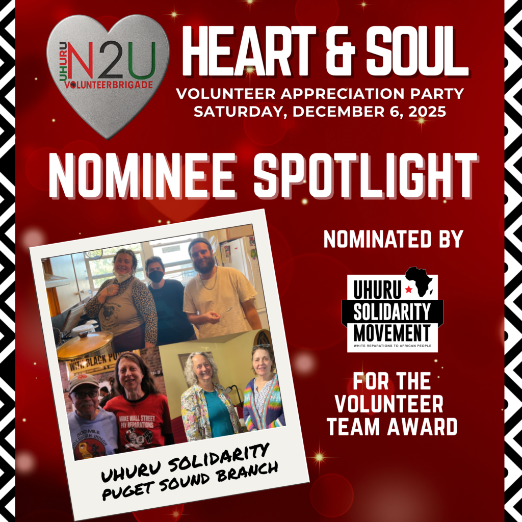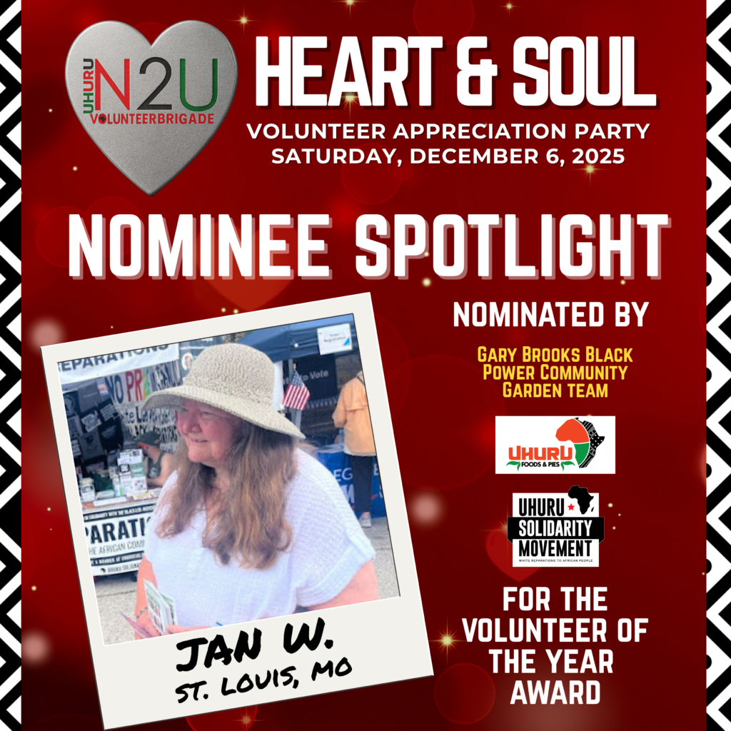 From the moment Jan W. signed up to join USM in 2024 she has been an exemplary volunteer whose solidarity with African self-determination has inspired others. Whether she is planting produce on Saturdays in the community garden, hitting the streets to drop literature for the Days of Reparations, putting up posters all around town, staffing outreach booths at local farmers markets, making phone calls to win donors and supporters, or taking notes in meetings, Jan takes on every volunteer activity with enthusiasm. In the aftermath of the tornado Jan was on the ground volunteering in solidarity with the Black Power Blueprint’s rebuilding campaign. She is persistent, dedicated and always brings a warm and optimistic spirit to every event. Jan keeps the organization informed of opportunities to build relationships and win more support. Jan’s love for the movement and for reparations to African people is expressed beautifully, both in her words and in her actions.