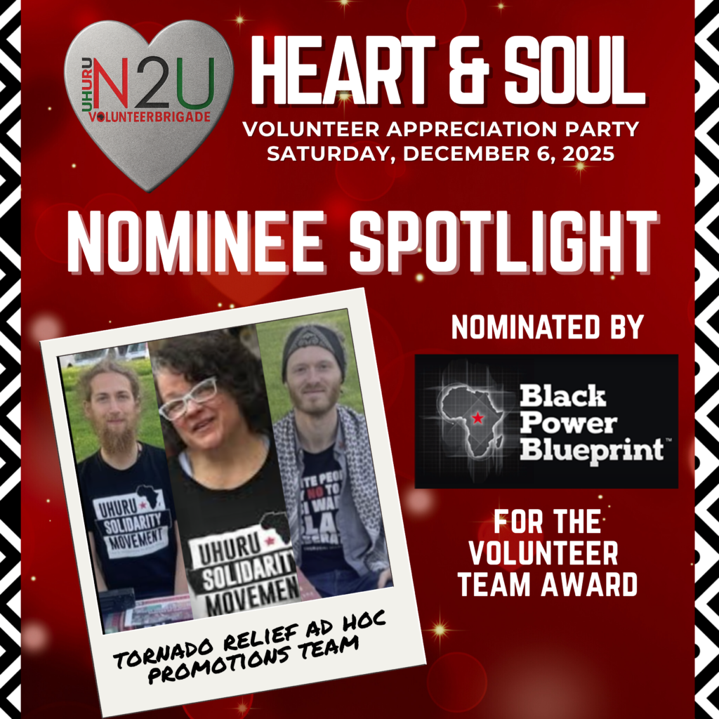 Members of the Uhuru Solidarity Movement—Virginia, Indigo, and Dylan—joined the Black Power Blueprint ad hoc Promo Team to urgently spread the word about our tornado response and relief resources. The committee existed for one month and started only days after the May 16th tornado. They worked to mobilize the community and demand real relief and accountability from the city government. Virginia coordinated social media efforts, posting twice a day—nonstop—for an entire month and was our project manager. Dylan and Indigo collaborated to create and edit dozens of videos, update the news section of our website, and track coverage from the mayor and city officials to expose the many ways North St. Louis was left to fend for itself during this life-and-death disaster. The contribution of this highly skilled, politically united team was an invaluable contribution to promoting and claiming the importance of the Black Power Blueprint at a critical time in the midst of a highly volatile situation with repression and resistance unfolding daily.