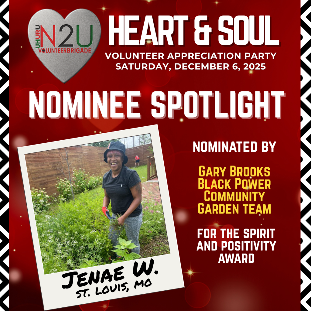 Jenae has been a friend and volunteer in the Gary Brooks Black Power Community garden for several years and even took the initiative to connect with us to make sure we knew how to contact her after her contact information changed! Jenae is dedicated to making positive change in her community and volunteers every Saturday that she is not working at her regular job! Jenae’s enthusiasm is infectious. She is strong and skilled, but also very humble. She engages positively with any and all tasks, whether weeding, planting or harvesting in the garden. Jenae puts a smile on your face every time she walks into the garden!