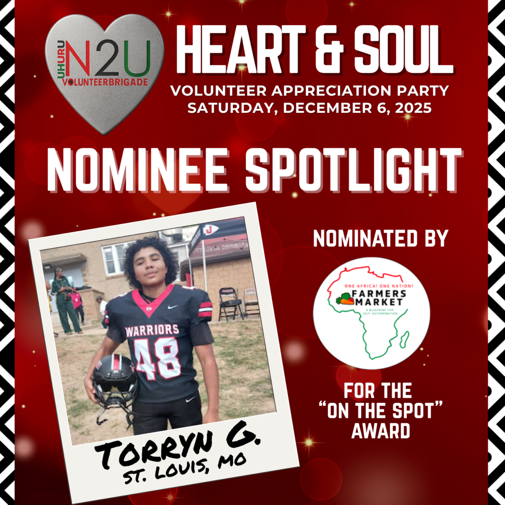 Torryn has been helping with the One Africa! One Nation! Farmers Market since 2022, when he was just 12 years old. Now 15, he continues to be one of our most reliable and enthusiastic volunteers. Whether it’s passing out flyers, putting up posters, setting up and breaking down tents and tables, or phone banking to reach vendors and community members, Torryn is always ready to step in when needed. Balancing school, football practice, and family responsibilities, he still makes time to show up for the market with a positive attitude. Torryn doesn’t wait to be asked—he notices what needs to be done and takes initiative, often lending a hand before anyone realizes help is needed. His consistency, energy, and dedication embody the spirit of the Farmers Market. We can always count on him, and the market wouldn’t be the same without his quiet leadership and dependable presence.