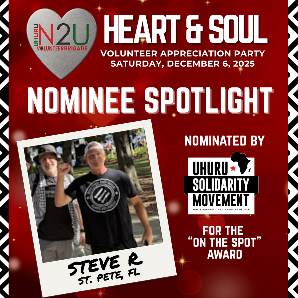 USM met Steve at a “No Kings” protest in St. Pete, and he immediately jumped in to help with transportation and outreach for our Artists Against Genocide benefit show in August of 2025. He also immediately began attending our weekly USM Tampa Bay branch, helping to get the word out about events, and pitching in to help whenever needed. Steve has also become a regular fixture at the St. Pete Uhuru Foods & Pies booth, volunteering on a regular basis. Recently he offered to help us pass out flyers at local businesses for our upcoming Teach-In. USM is proud to nominate Steve for the “On the Spot” award!!